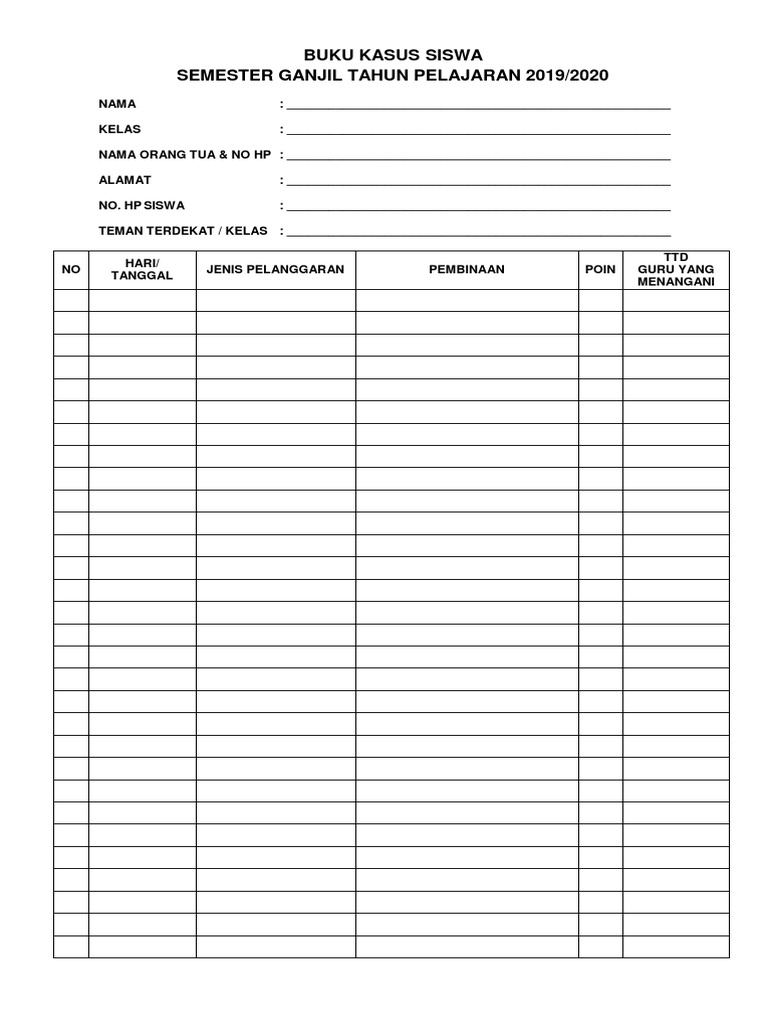 Tata tertib siswa adalah semua peraturan yang diberlakukan di sekolah untuk siswa. Buku agenda guru adalah buku kerja yang berisi catatan aktivitas guru selama pembelajaran baik yang dilakukan di dalam maupun di luar kelas. Contoh kasus bimbingan di konseling bk jasa pembuatan administrasi bpbk di sekolah dan ptkbk hubungi kami di 081222940294. Sri soedewi masjchun sofwan, sh jambi tujuan penelitian ini adalah untuk memperoleh bagaimana gambaran peran guru slb dan upaya yang dilakukan oleh guru dalam membimbing anak dengan Sesuai dengan peraturan menteri negara pemberdayaan aparatur negara dan reformasi birokrasi. Format buku catatan kasus siswa dan solusinya terbaru 2018 ini merupakan file terbaru yang akan saya bagikan dalam kesempatan kali ini. Sedangkan, buku kasus siswa adalah buku untuk mencatat semua kasus siswa. Silahkan unduh saja melalui tauan yang kami sediakan di bawah ini. Contoh buku catatan kasus siswa ini merupakan file terbaru yang akan saya share secara gratis khususnya untuk melengkapi administrasi guru/ wali kelas.